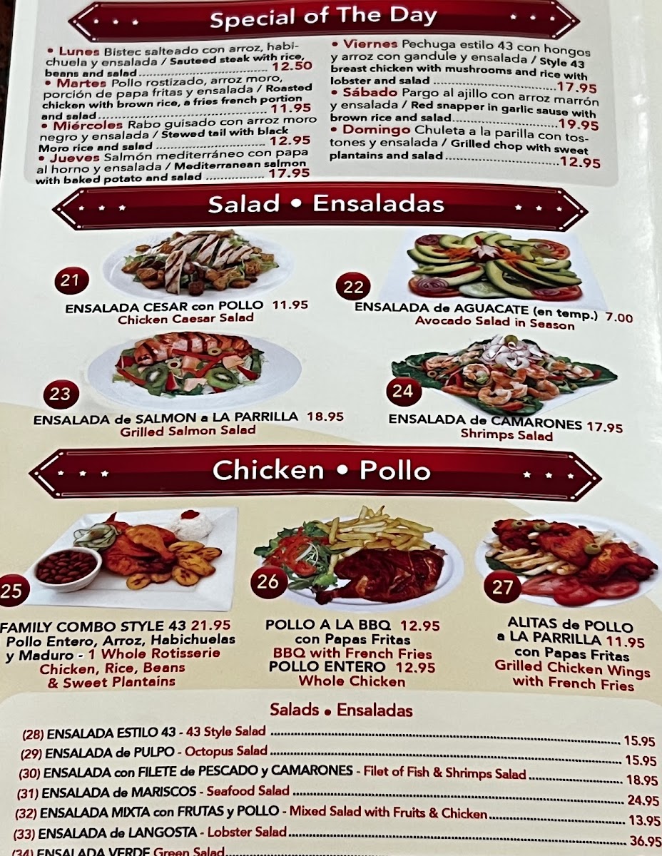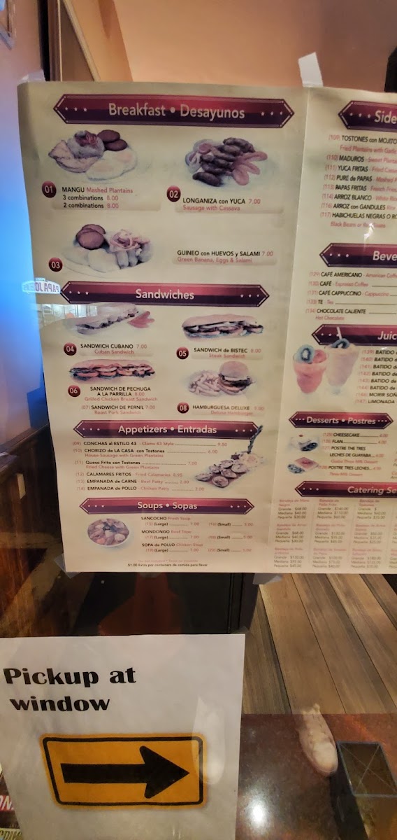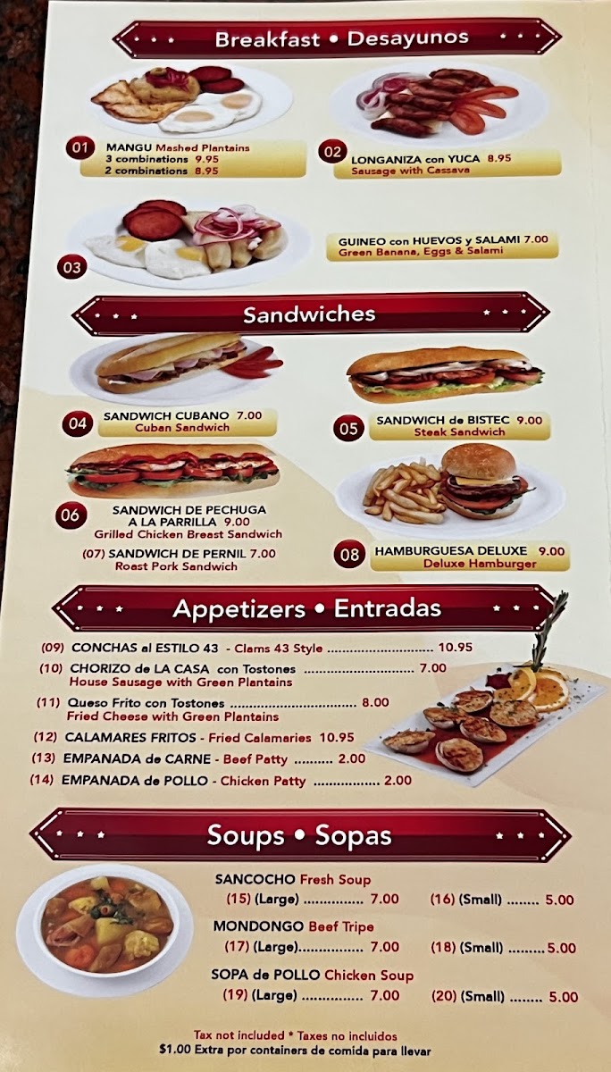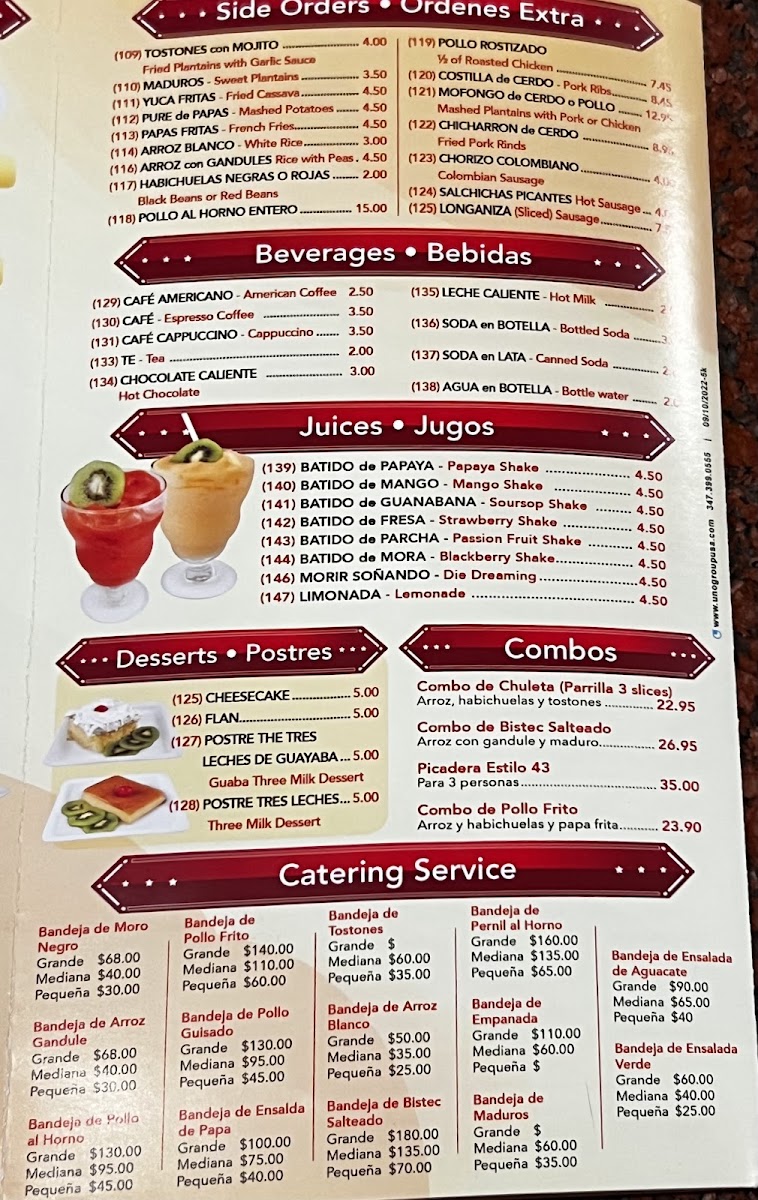 Elena's Restaurant 43 offers a rich and diverse menu, reflecting a fusion of traditional and modern flavors. For sandwiches, options like Sandwich Cubano and Sandwich De Pernil are popular choices, showcasing hearty fillings with Swiss and American cheeses. Appetizers such as Empanada De Queso and Chorizo De La Casa with Green Plantains kick off the meal with a burst of flavor. Their beef dishes, including the savory Carne Guisada and tender Oxtail Stew, are comforting classics. For pork lovers, there are hearty plates like Chicharron De Cerdo and Costillas De Cerdo Al Horno. Seafood enthusiasts can enjoy dishes like Paella Estilo 43 or Camarones A La Parrilla, alongside fresh salads such as Ensalada De Pulpo or Ensalada De Langosta. The dessert selection is equally tempting with options like Pineapple Tres Leche and Flan. Complementing the meals, the drink offerings range from refreshing Batido De Mango to classic sodas like Coca-Cola (Can). Elena’s 43 also serves robust soups like Sancocho and Sopa De Camarones, as well as a variety of chicken dishes, such as Pollo A La BBQ and Pechuga Al Ajillo. With a menu this varied, there's something for every palate, making Elena's 43 a go-to spot for a satisfying meal in Queens Village.