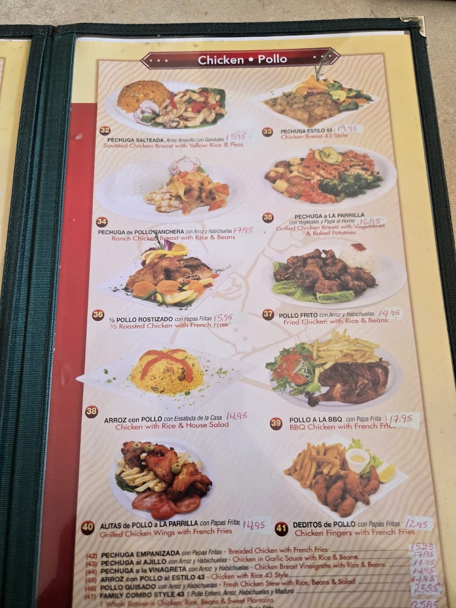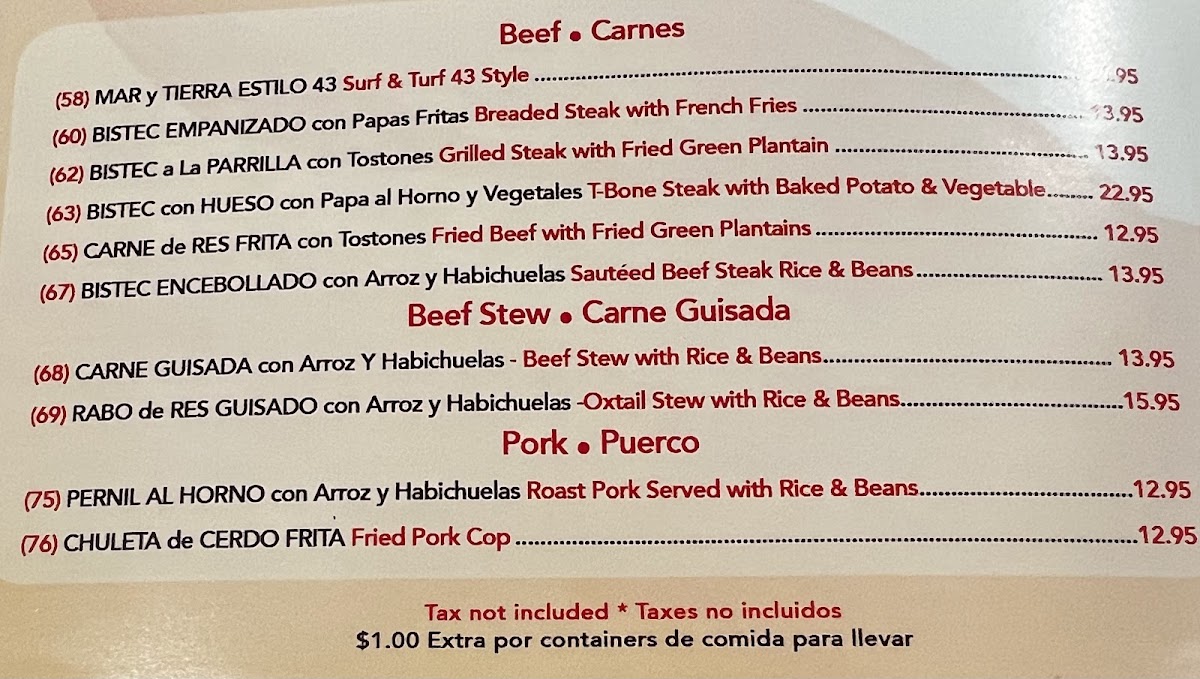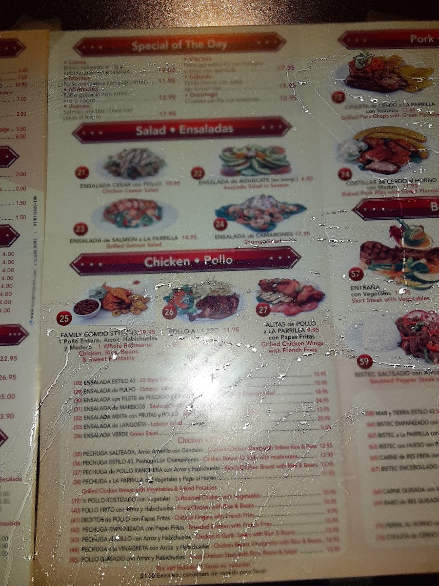 Elena's Restaurant 43 offers a rich and diverse menu, reflecting a fusion of traditional and modern flavors. For sandwiches, options like Sandwich Cubano and Sandwich De Pernil are popular choices, showcasing hearty fillings with Swiss and American cheeses. Appetizers such as Empanada De Queso and Chorizo De La Casa with Green Plantains kick off the meal with a burst of flavor. Their beef dishes, including the savory Carne Guisada and tender Oxtail Stew, are comforting classics. For pork lovers, there are hearty plates like Chicharron De Cerdo and Costillas De Cerdo Al Horno. Seafood enthusiasts can enjoy dishes like Paella Estilo 43 or Camarones A La Parrilla, alongside fresh salads such as Ensalada De Pulpo or Ensalada De Langosta. The dessert selection is equally tempting with options like Pineapple Tres Leche and Flan. Complementing the meals, the drink offerings range from refreshing Batido De Mango to classic sodas like Coca-Cola (Can). Elena’s 43 also serves robust soups like Sancocho and Sopa De Camarones, as well as a variety of chicken dishes, such as Pollo A La BBQ and Pechuga Al Ajillo. With a menu this varied, there's something for every palate, making Elena's 43 a go-to spot for a satisfying meal in Queens Village.
